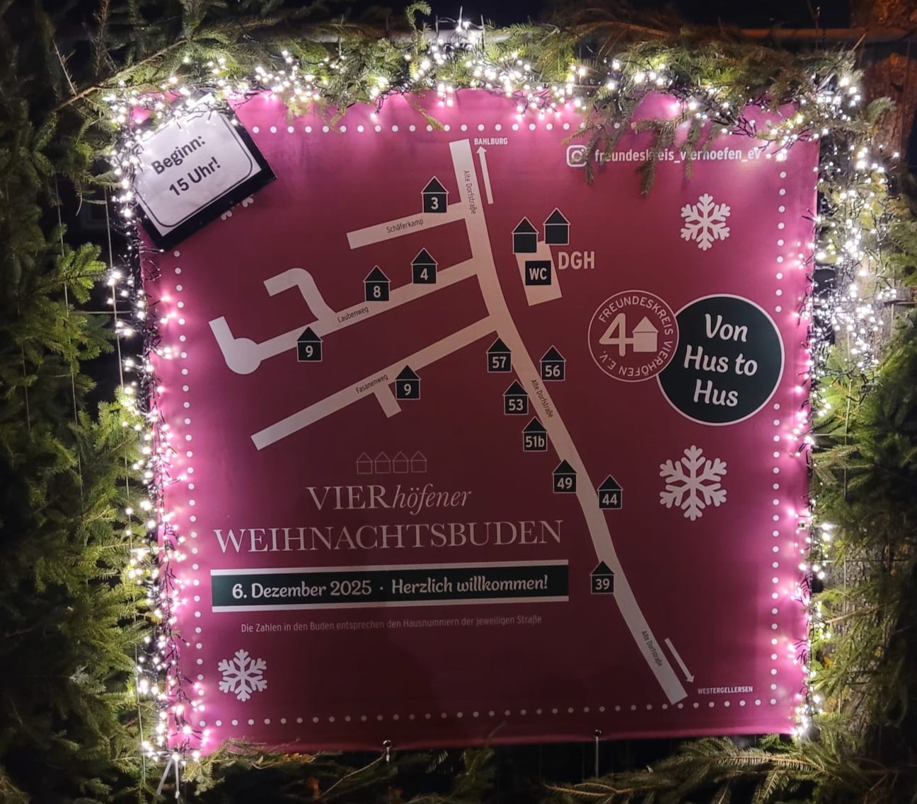 - Buden to Hus 2024Vierhöfen: In den Straßen gehen die Lichter an! Am Samstag, 7. Dezember 2024 wird es in Vierhöfen wieder weihnachtlich: in den Straßen Immenhagen, Rehleinstraße und Hinterm Bach finden von 15 bis 18 Uhr die „Weihnachtsbuden Weiterlesen…