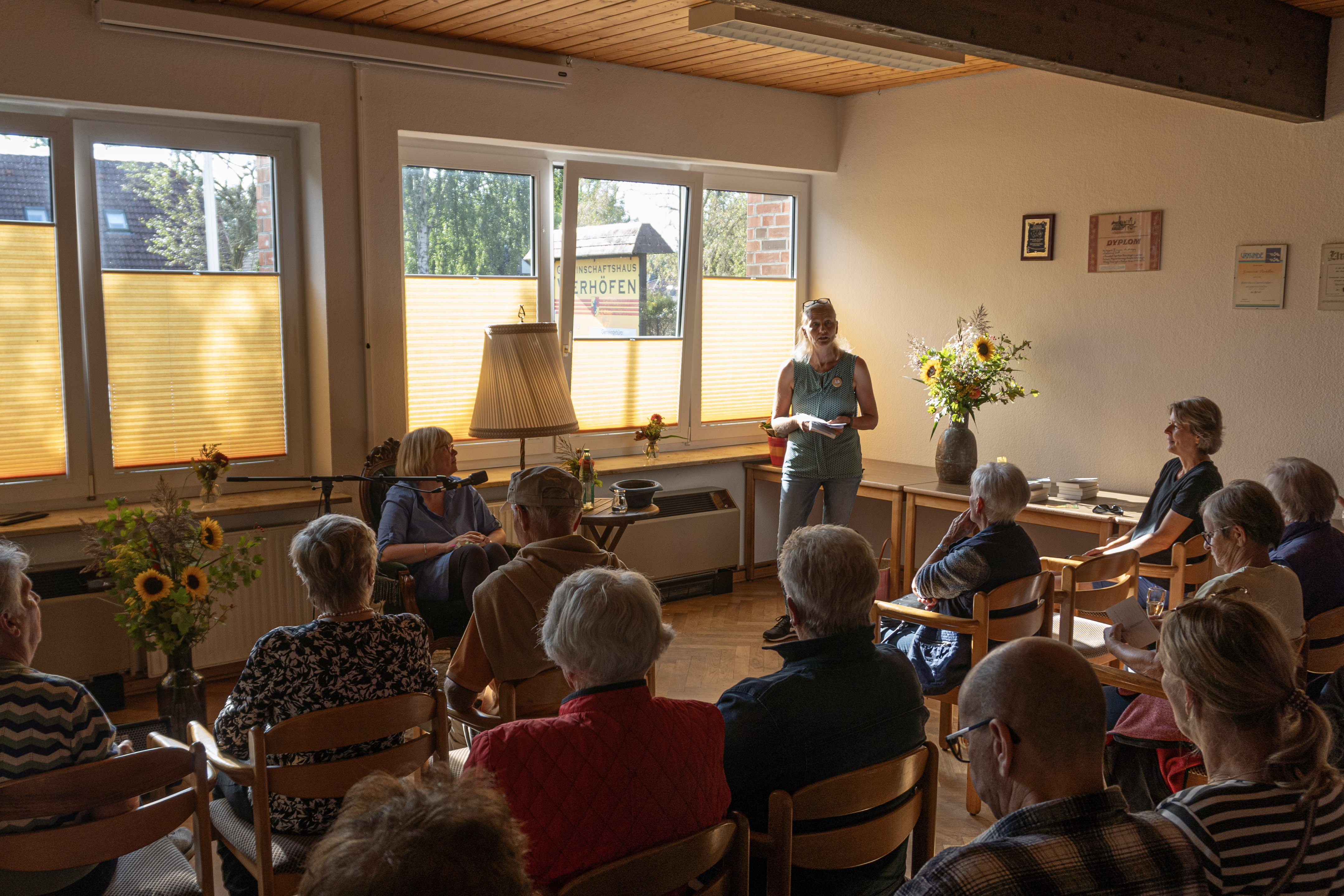 Nach der feierlichen Eröffnung der „Bücherbutze“ stellte Sabine Lehmbeck ihr Buch „Dorf, Stadt, Fluss“ im Dorfgemeinschaftshaus vor. Die Autorin begeisterte in Vierhöfen mit ihrer lockeren und unterhaltsamen Art bei der Vorstellung ihres ersten Romans das Publikum und weckte den Wunsch nach einer erneuten Veranstaltung.